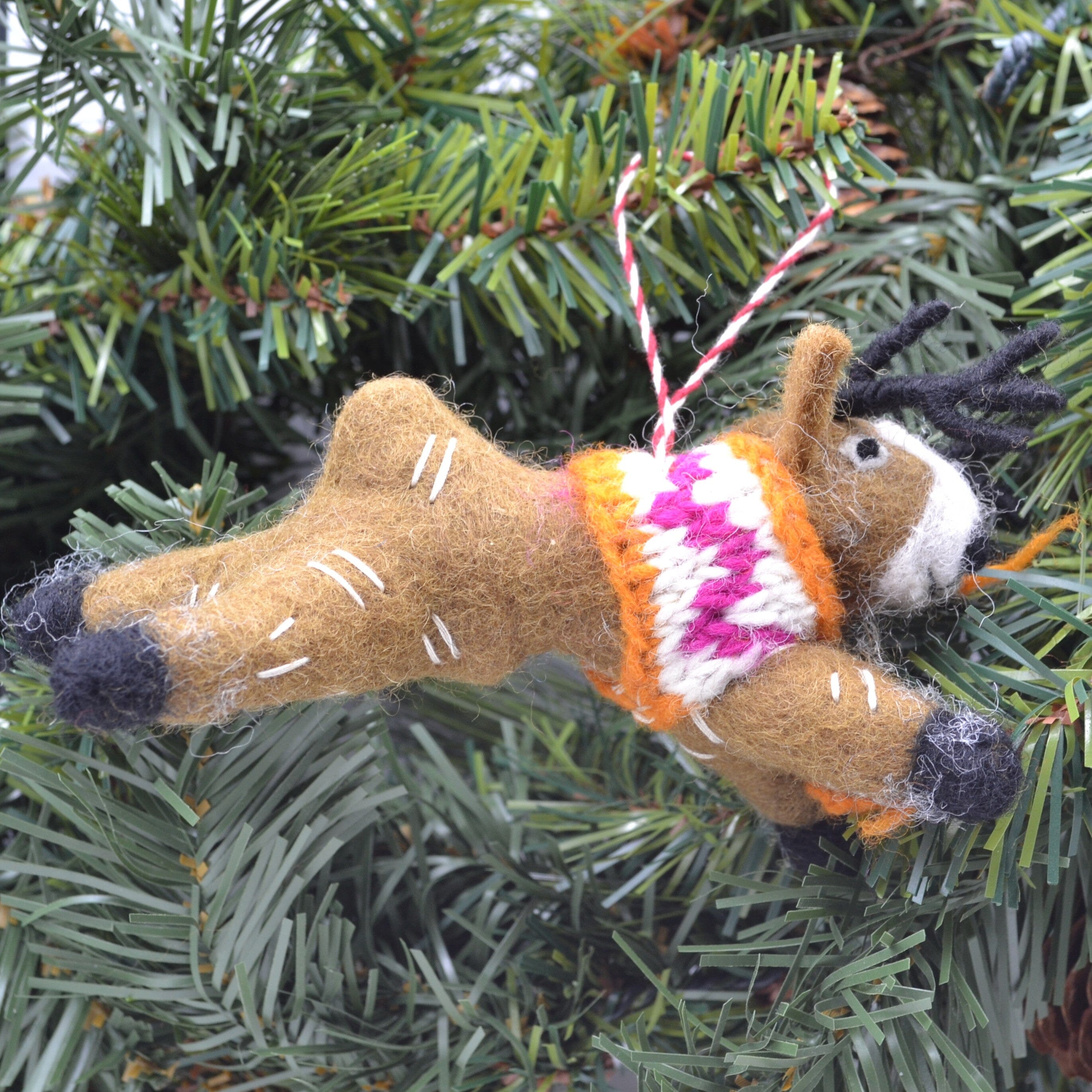 A leaping reindeer decked out with an argyle sweater. A very cute ornament to hang on your tree.