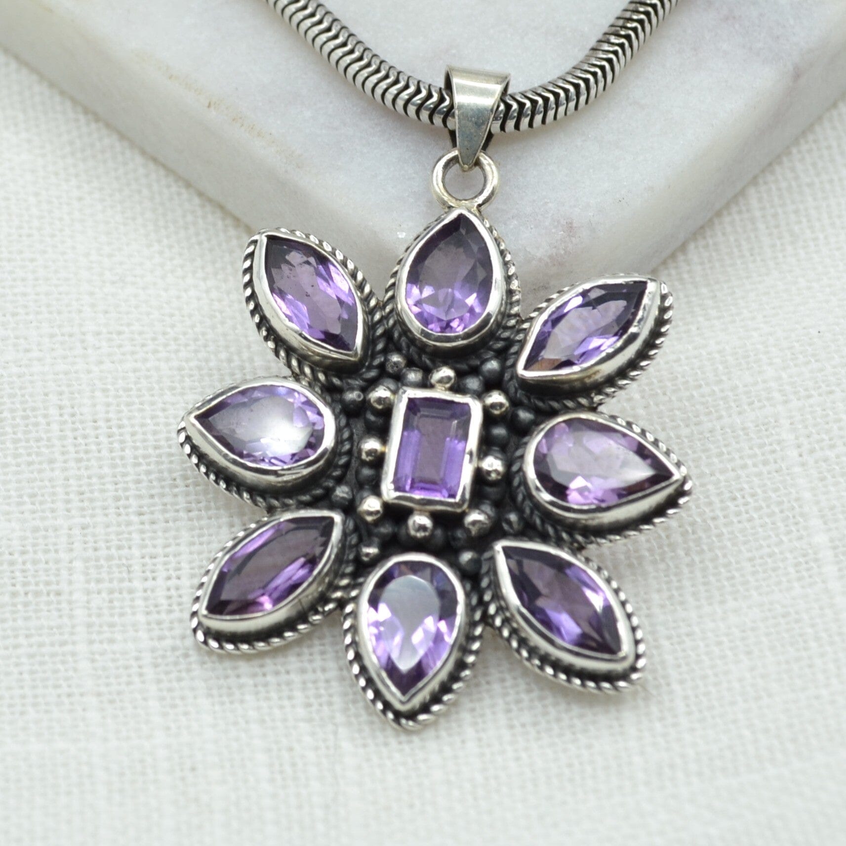 Beautiful and luxurious, this pendant is a true statement piece! Nine stones of amethyst banded and joined by exquisite silver braids and swirls. This piece sparkles with the best work of Nepalese silversmiths. Made to be admired and enjoyed.