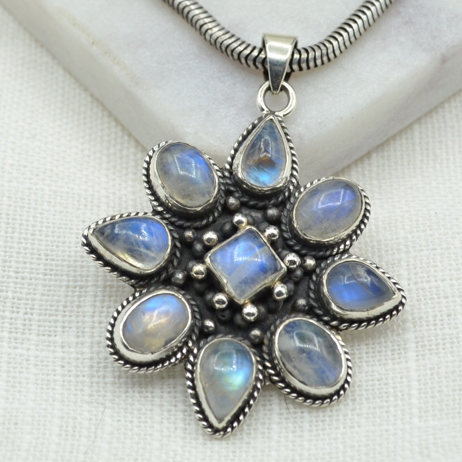 This is a pendant that will turn heads! A circle of nine stones of rainbow moonstone enhanced by gorgeous silver work creates a beautiful and unique piece that you will love for years to come.